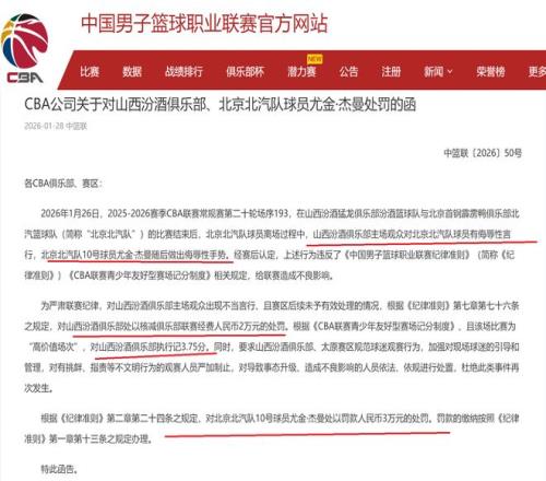 體育哲人2026-01-28 18:25:34 0 #CBA   #罰單   #罰款   #山西隊   #山東男籃   #cba聯賽   #北京隊傑曼   #傑曼·傑克森