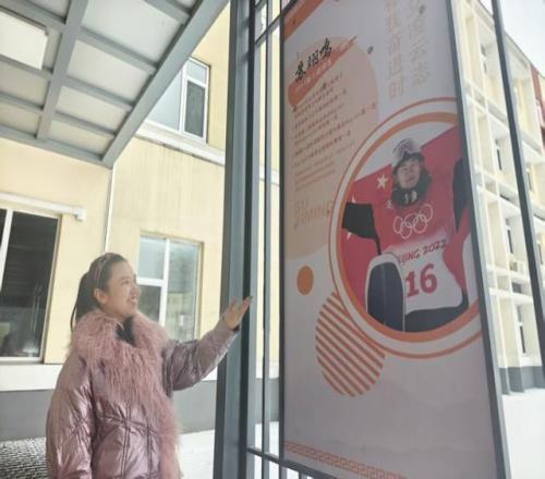 何玲在吉林市鬆江東路小學校(原吉林市萬達實驗小學校)文化長廊介紹蘇翊鳴展示板。新華社記者 周萬鵬 攝