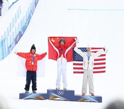 剛剛結束的單板滑雪男子坡麵障礙技巧決賽中,蘇翊鳴以三跳最好一輪82.41分的成績獲得冠軍,為中國隊奪得了本屆冬奧會的第一枚金牌。同樣是在這片場地,10天前的男子單板滑雪大跳台決賽,蘇翊鳴則以兩輪總分168.50分獲得季軍,為中國體育代表團奪得本屆冬奧會首枚獎牌。