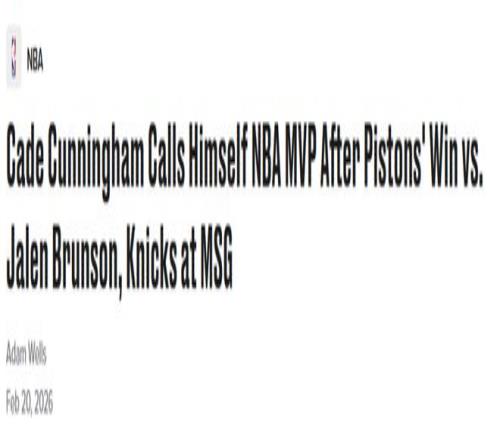 在率隊大勝紐約尼克斯、再度打出統治級表現後,底特律活塞球星坎寧安堅信,NBA常規賽MVP獎杯已是他的囊中之物。昨日活塞以126‑111取勝後,坎寧安接受ESPN采訪時,直言自己就是當下的MVP。