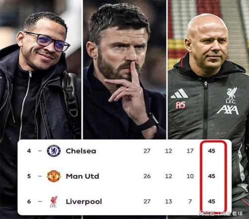 英超第27輪,9場比賽已經結束,靜等曼聯最後出場。目前,英超積分榜形成一道奇觀,切爾西、曼聯和利物浦三大豪門,積分相同,都是45分,分別排在第四到第六,其中曼聯少賽一場。