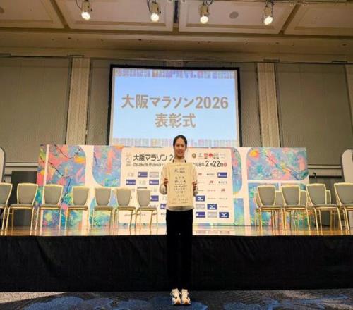 在大阪馬拉鬆頒獎儀式現場的鄭小倩