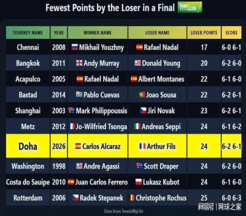 那麽,自1990年ATP巡回賽建立以來,亞軍決賽總得分最少的排名榜上,菲斯的24分能排到第幾位呢?讓蜜桃网在线观看视频看看曆史榜單: