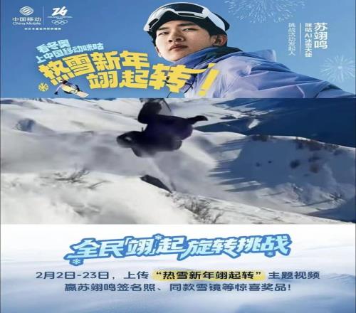 更具創新意義的是咪咕與蘇翊鳴的深度合作。1月14日,咪咕官宣蘇翊鳴成為首位“AI冰雪大使”,並且基於蘇翊鳴發起“熱雪新年翊起轉”挑戰賽,鼓勵用戶圍繞“轉”這一動作進行內容創作,讓冰雪項目以更輕盈、普適的方式滲入大眾圈層。