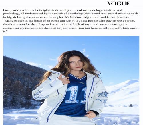 例如穀愛淩的比賽服融合了青花瓷紋樣與青龍刺繡的設計,在互聯網上的討論熱度頗高。不僅國內網友爭相曬圖求同款,就連海外社區也對這件衣服頗為認可,時尚雜誌《Vogue》更在最新一期采訪中刊登了她身著安踏戰袍的照片。全程參與設計的穀愛淩顯然也對這件裝備十分滿意,賽後接受外媒采訪時毫不掩飾自己的喜愛與驕傲。